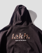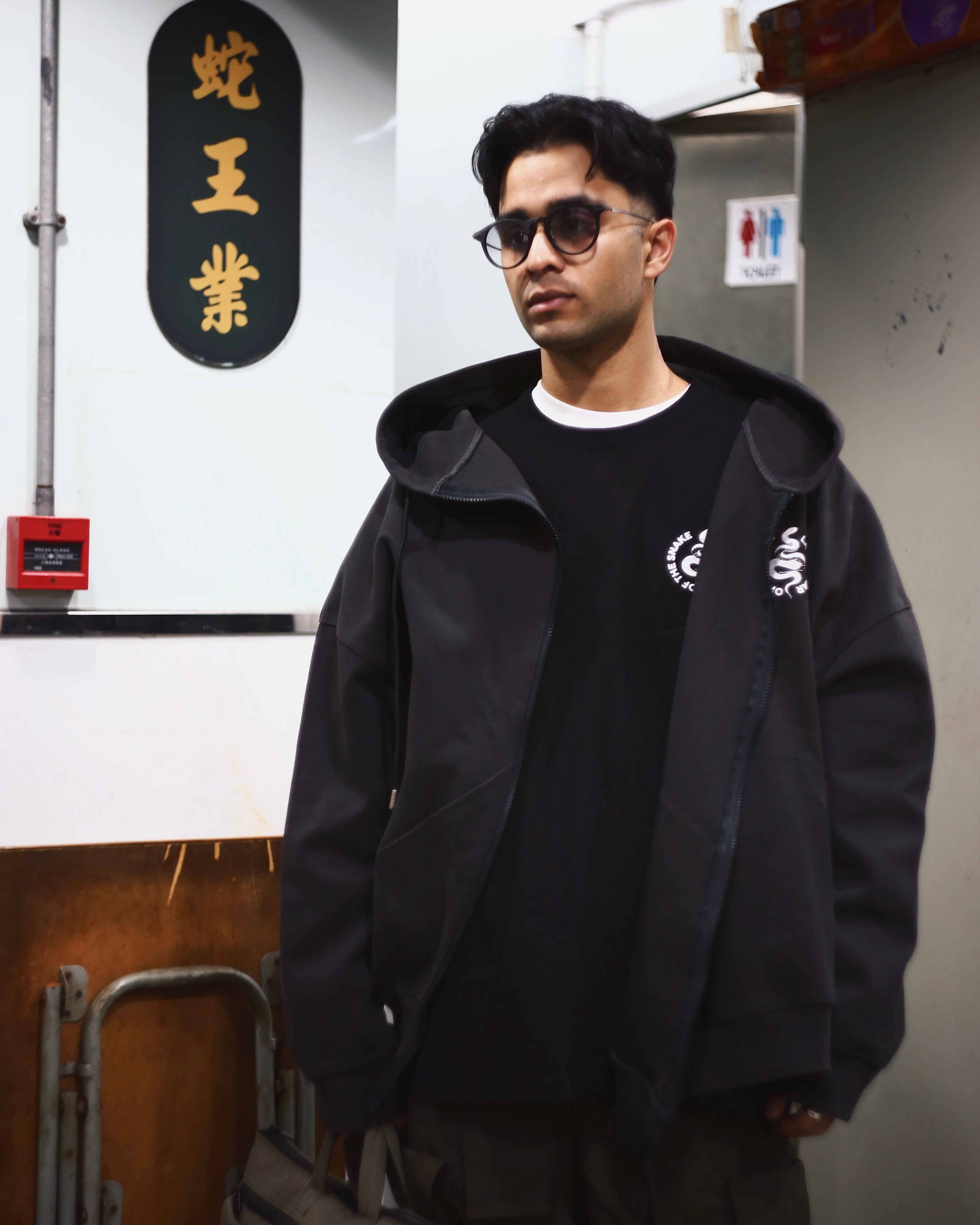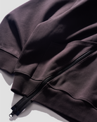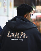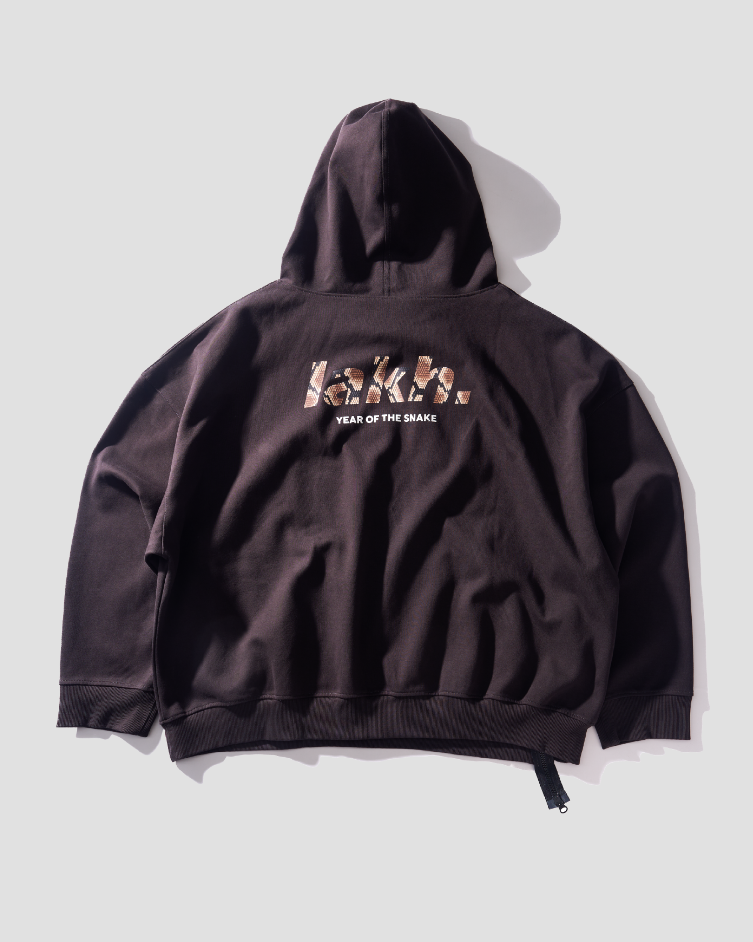 The YOTS Slanted Zip-Up Hoodie features an oversized fit. The exterior is made of contrasting 100% cotton, giving it a textured look. The design includes a printed LAKH logo on the back, drop shoulder style, and comes equipped with two side pockets.