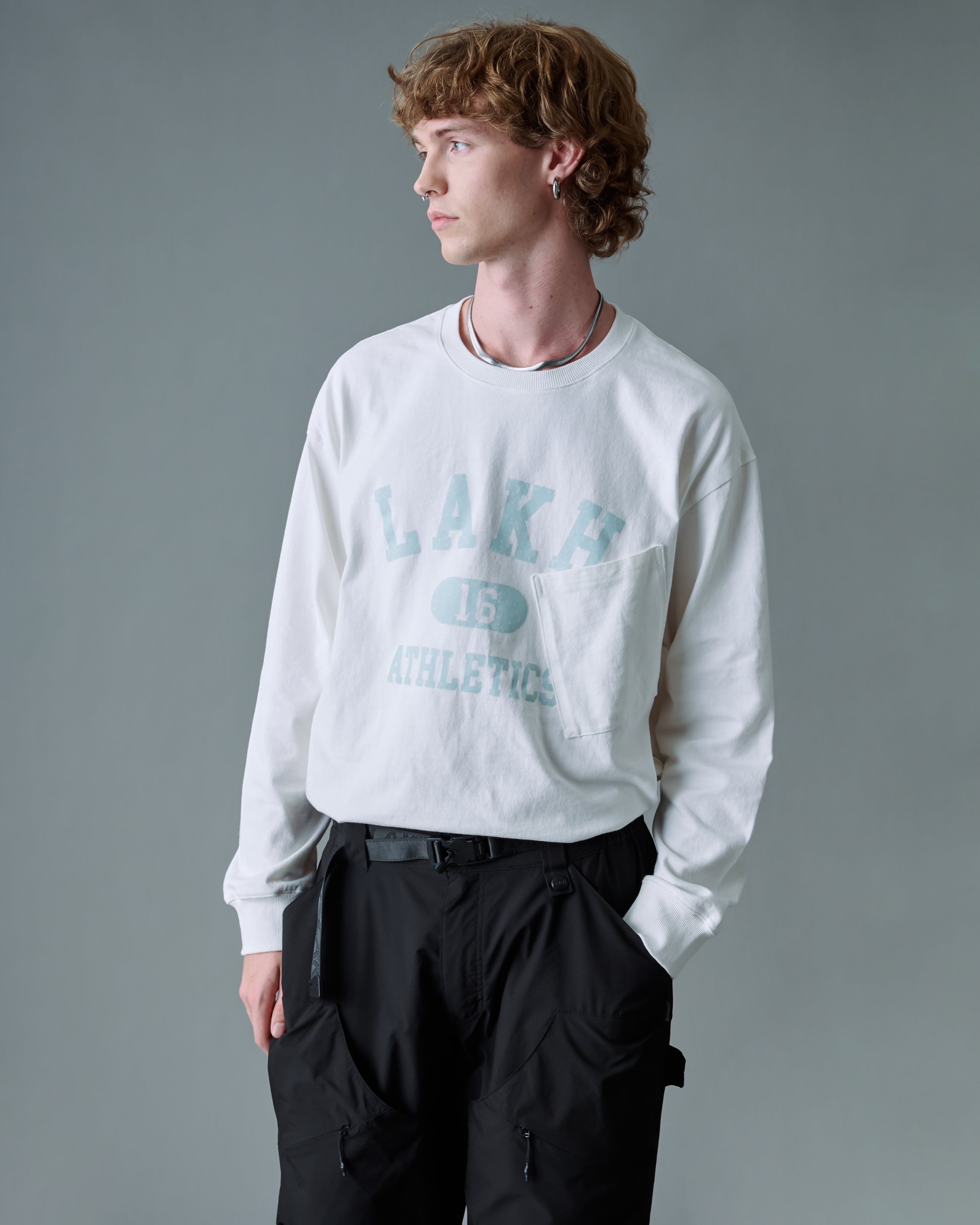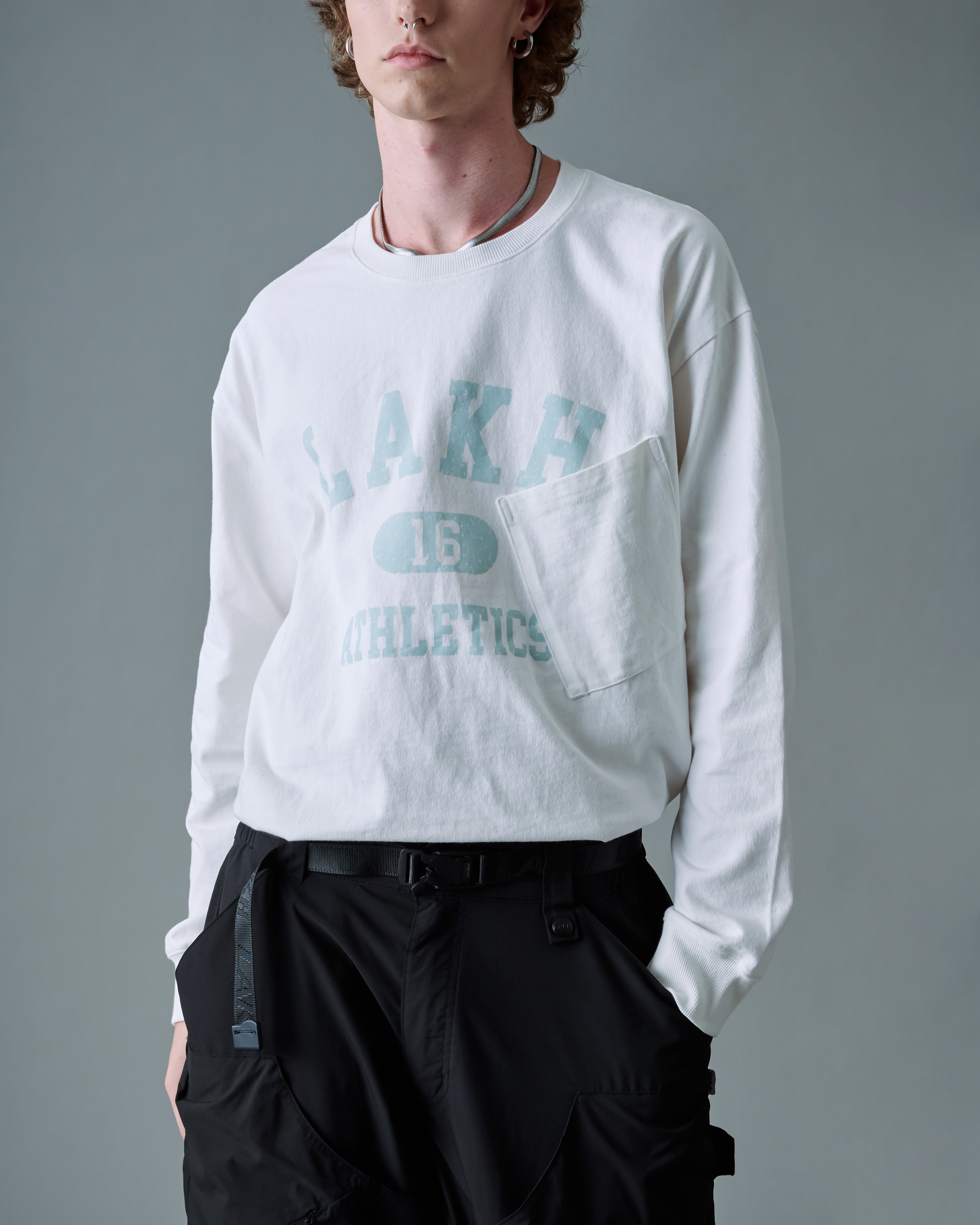 The College Logo Pocket L/S Tee is constructed from premium cotton fabric and styled in a relaxed fit. Features crack LAKH college logo print on the front.