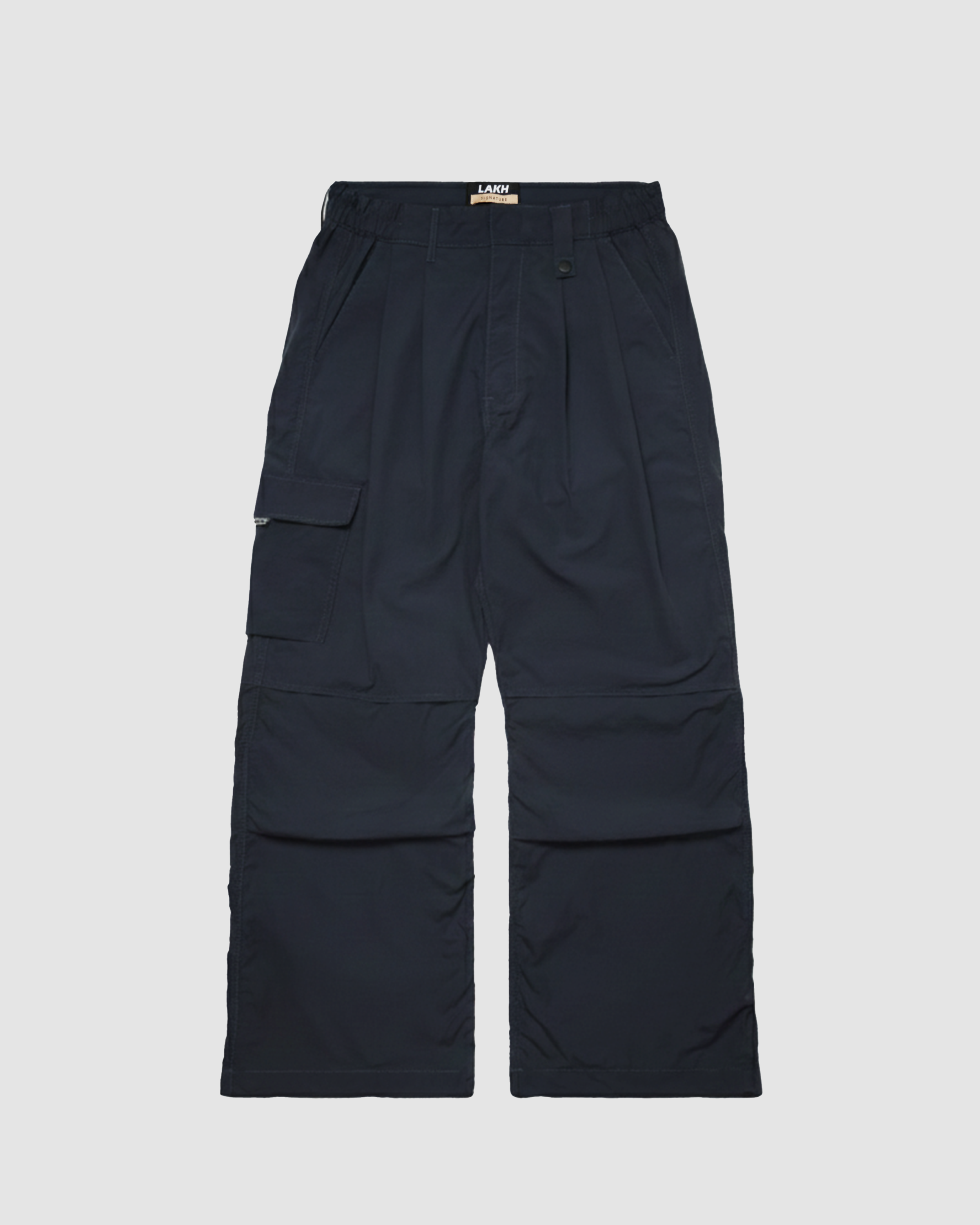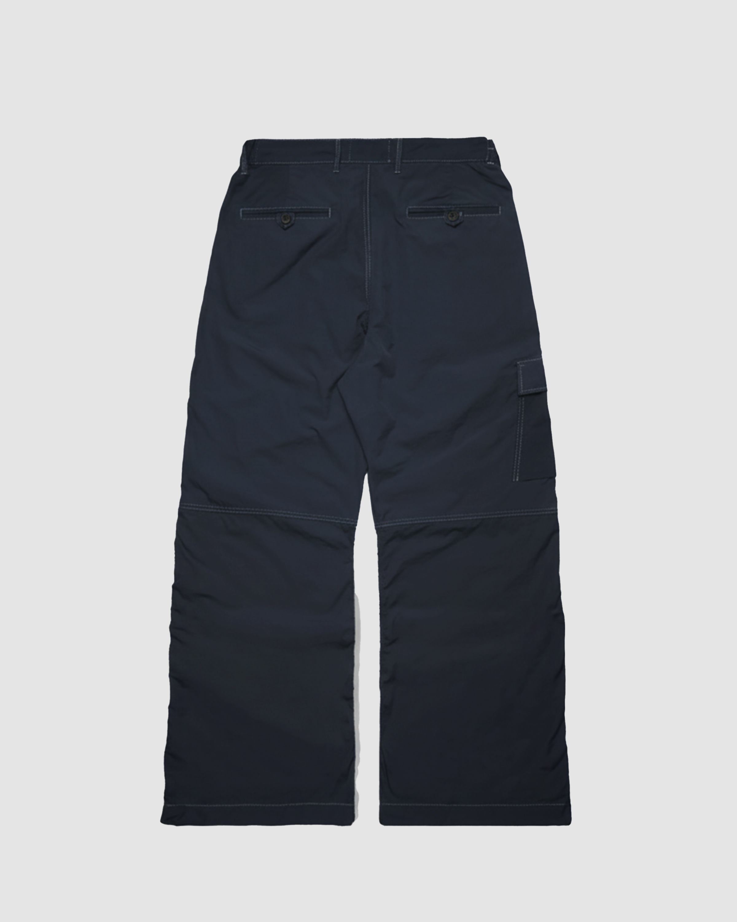 The Flared Cargo Pants are made from durable nylon material, wide cut that flares to a wide boot cut from the knee. Features two side slit pockets, two back welt pockets, and one functional pocket.
