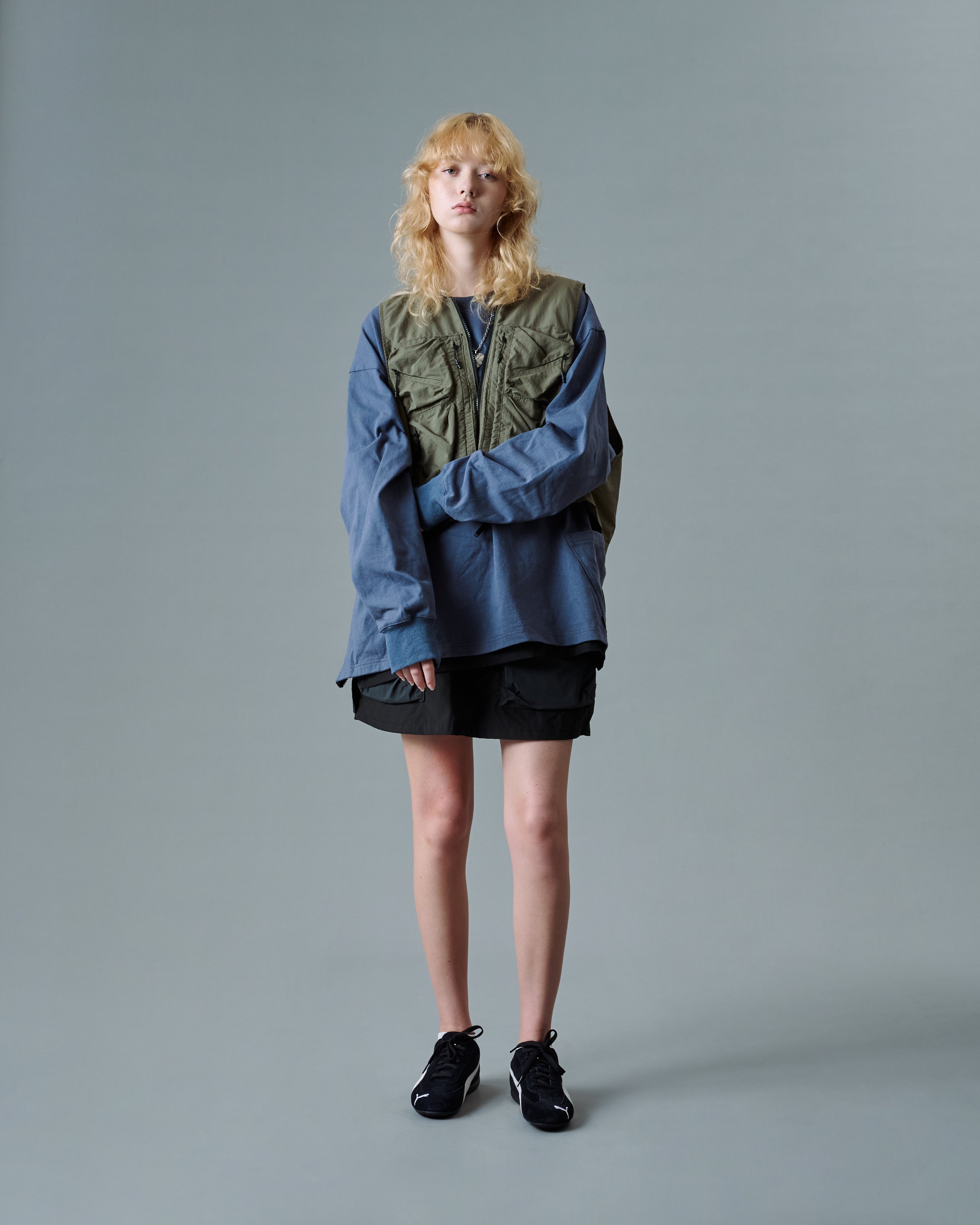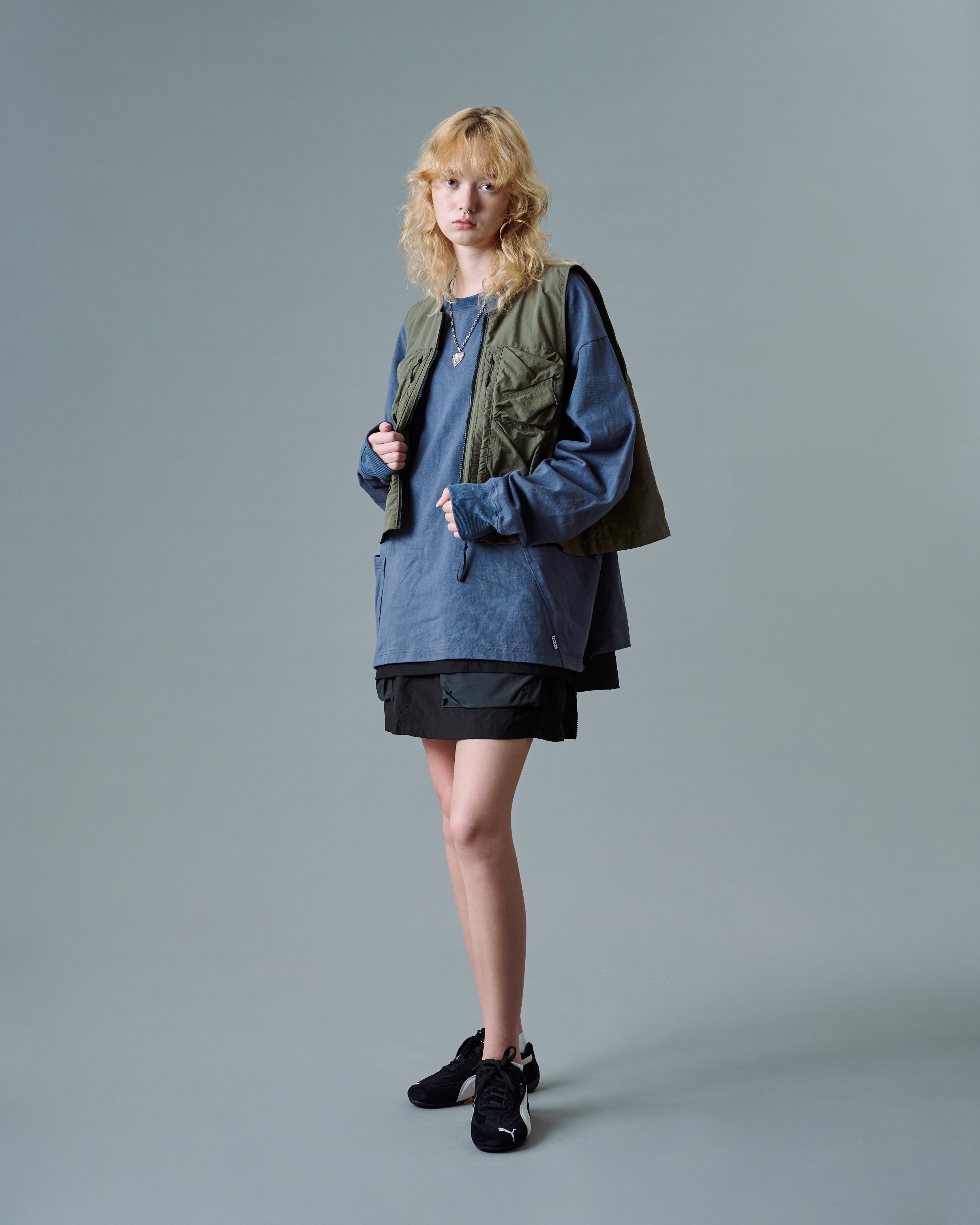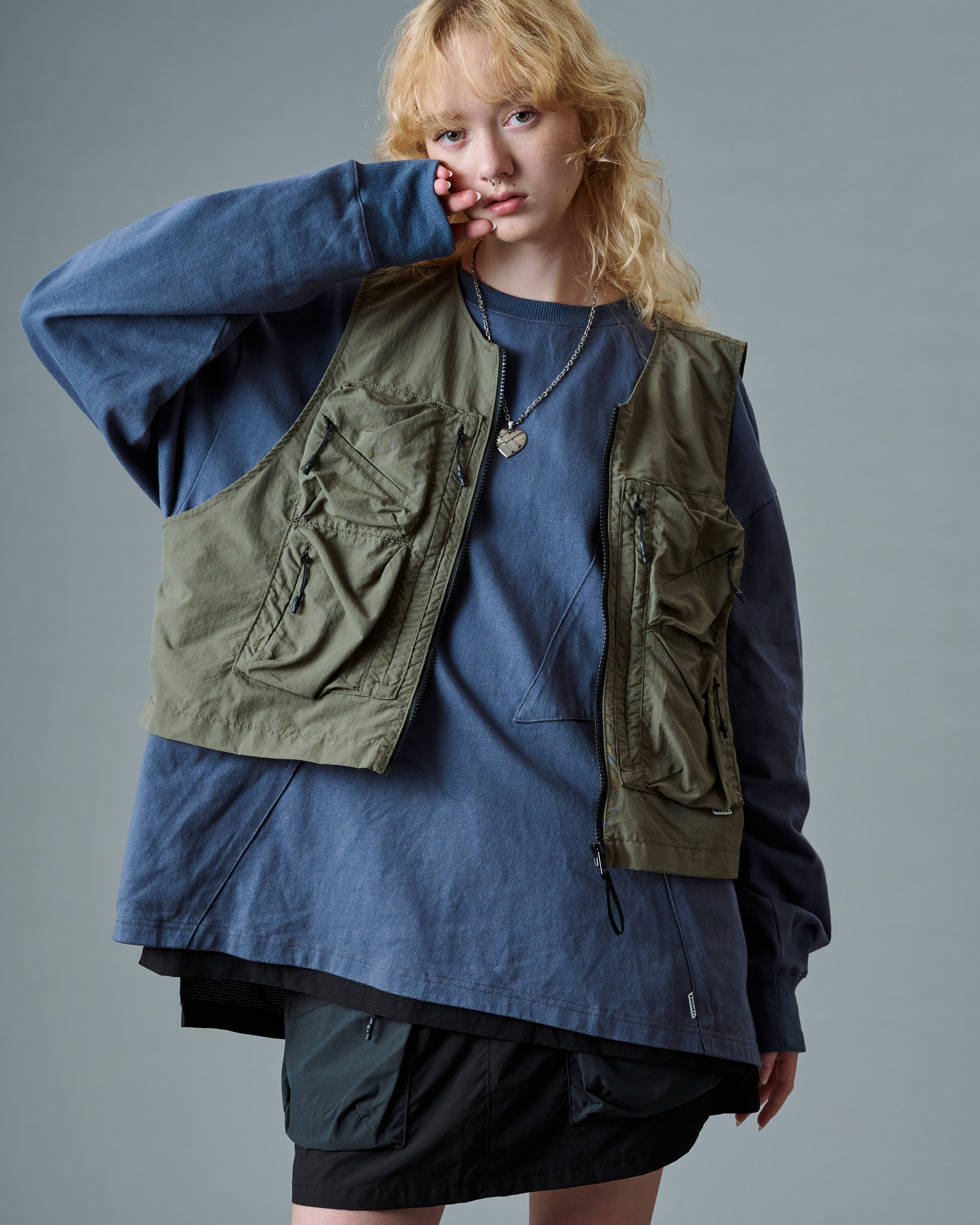 The Tri-Pocket Layer L/S Tee is constructed from cotton fabric with side slits. Designed with an oversized fit and features 3 functional pockets and a double-layer design.