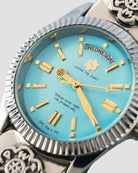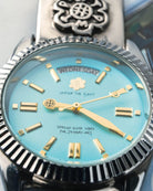 Crafted as a reminder that time is our most precious currency, the ETERNA Quality Time Watch features a polished chrome metal strap with sculptural detailing, giving it a bold yet timeless edge. The dial, rendered in an eye-catching Tiffany blue, balances vibrant color with refined minimalism.