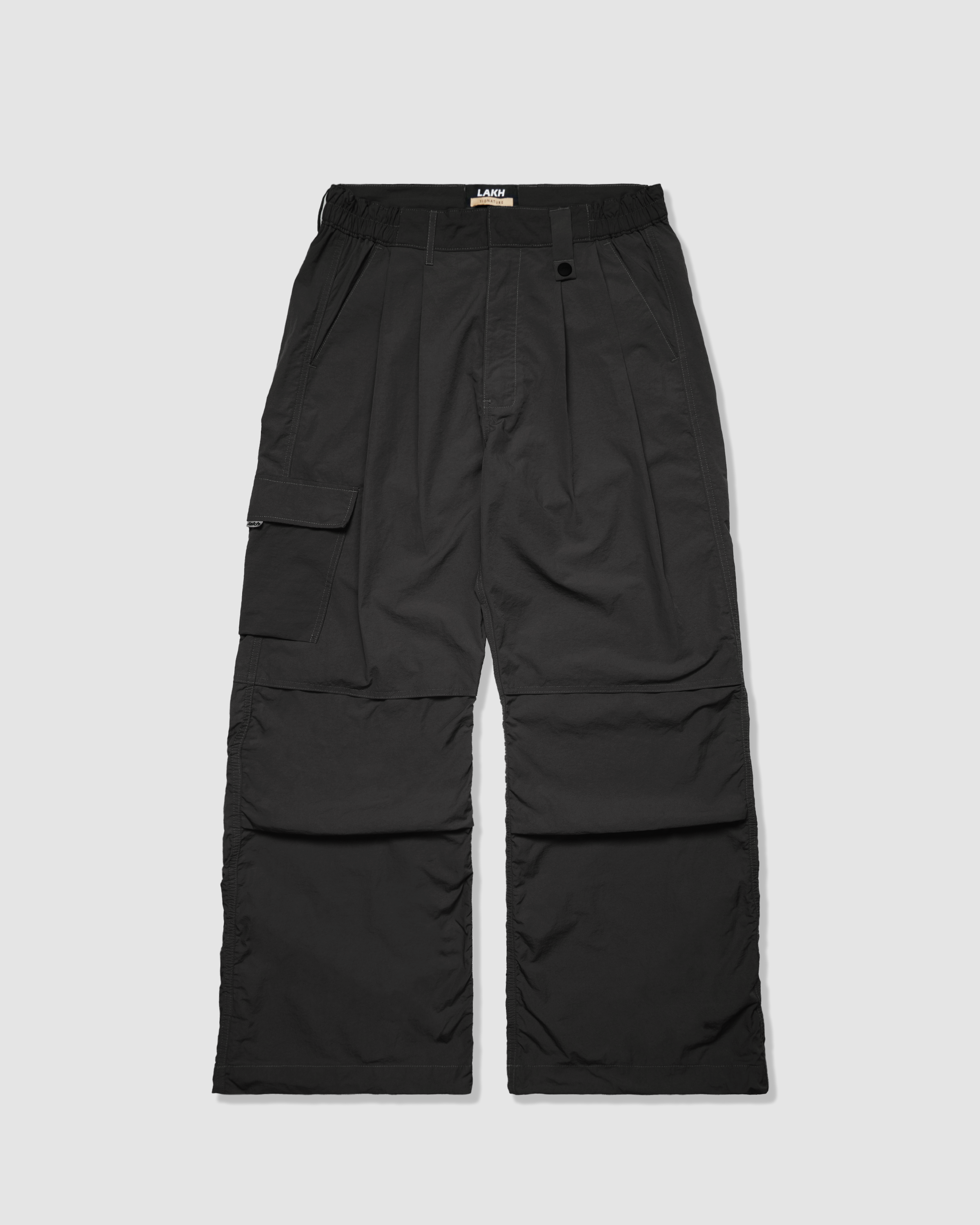 The Flared Cargo Pants are made from durable nylon material, wide cut that flares to a wide boot cut from the knee. Features two side slit pockets, two back welt pockets, and one functional pocket.