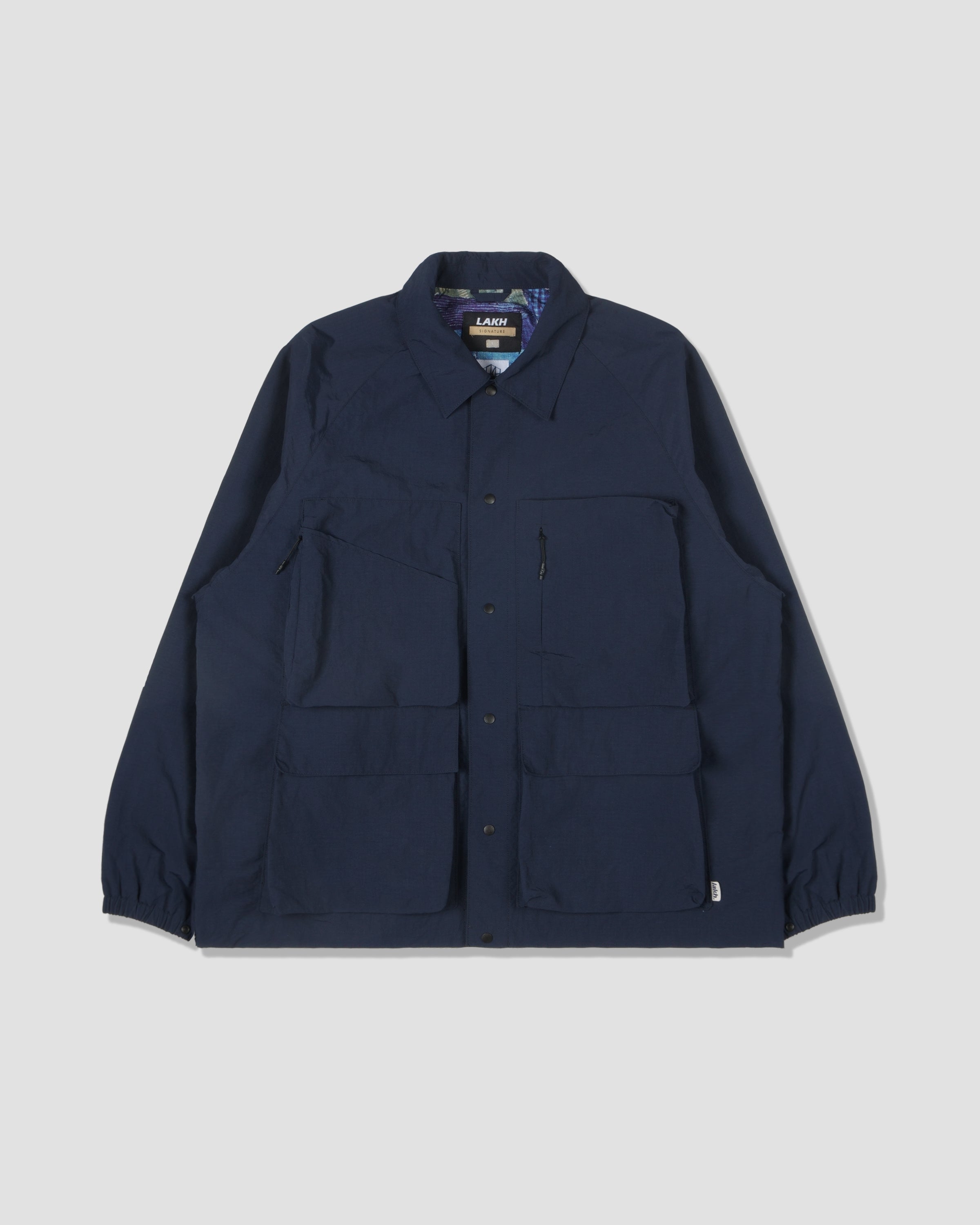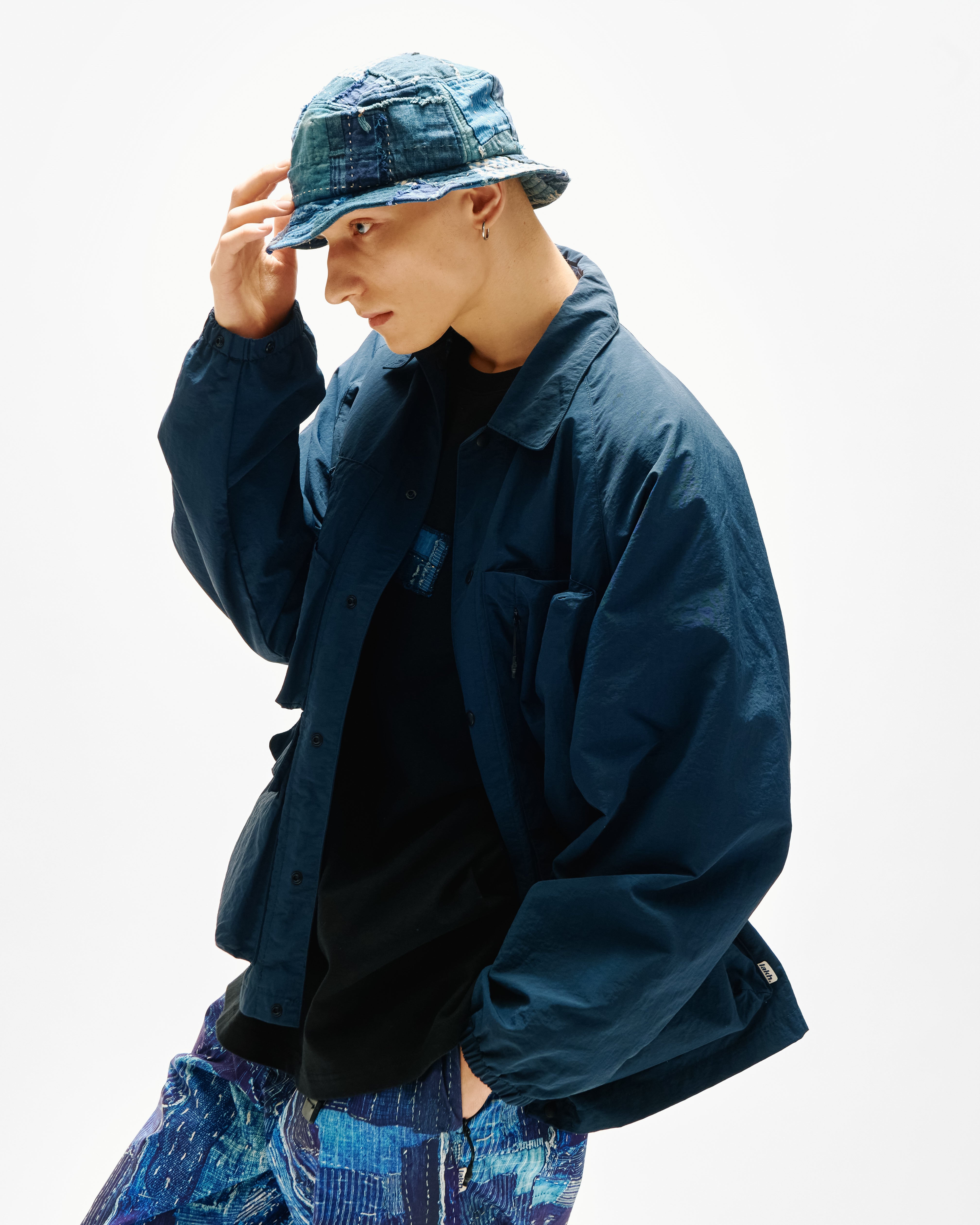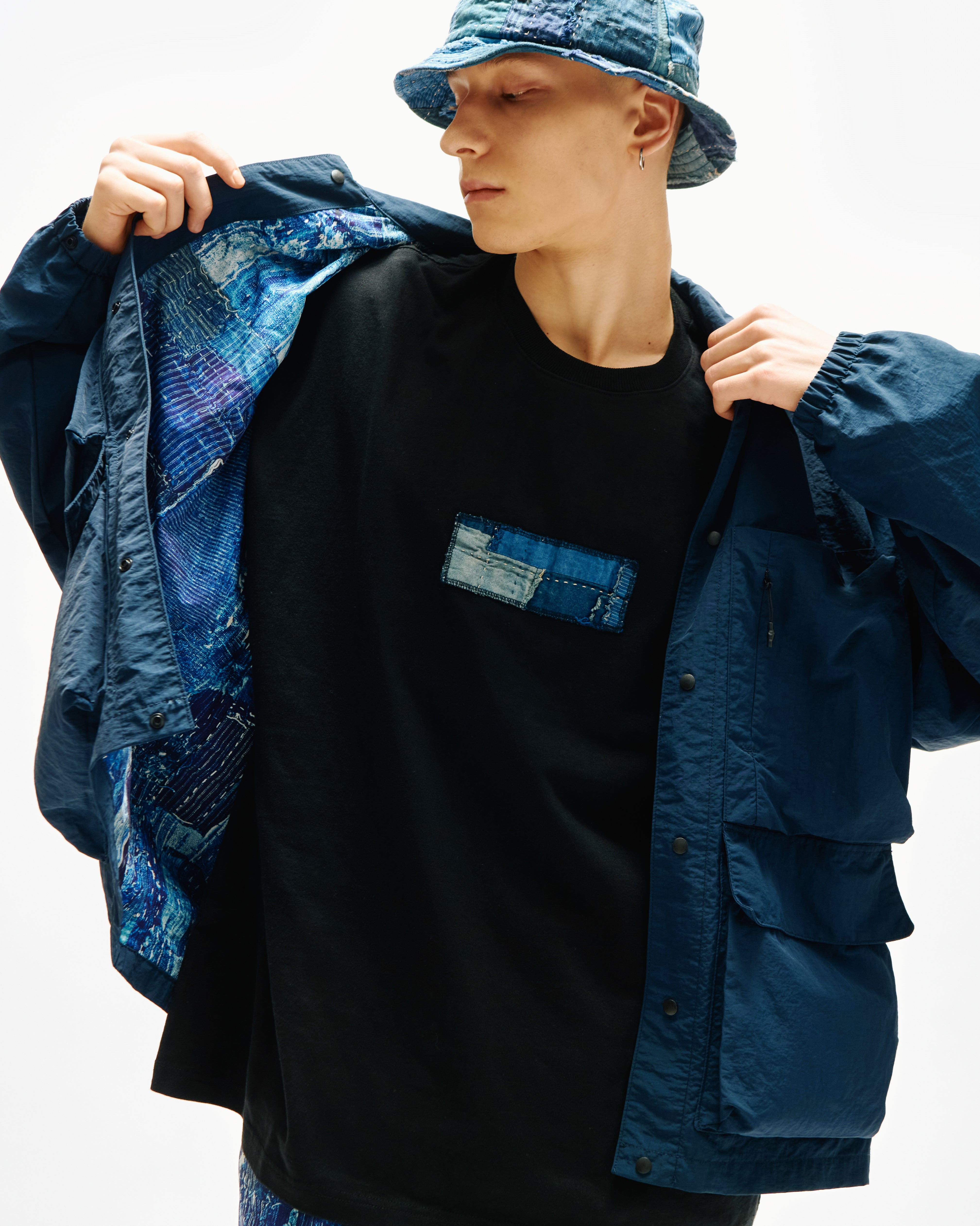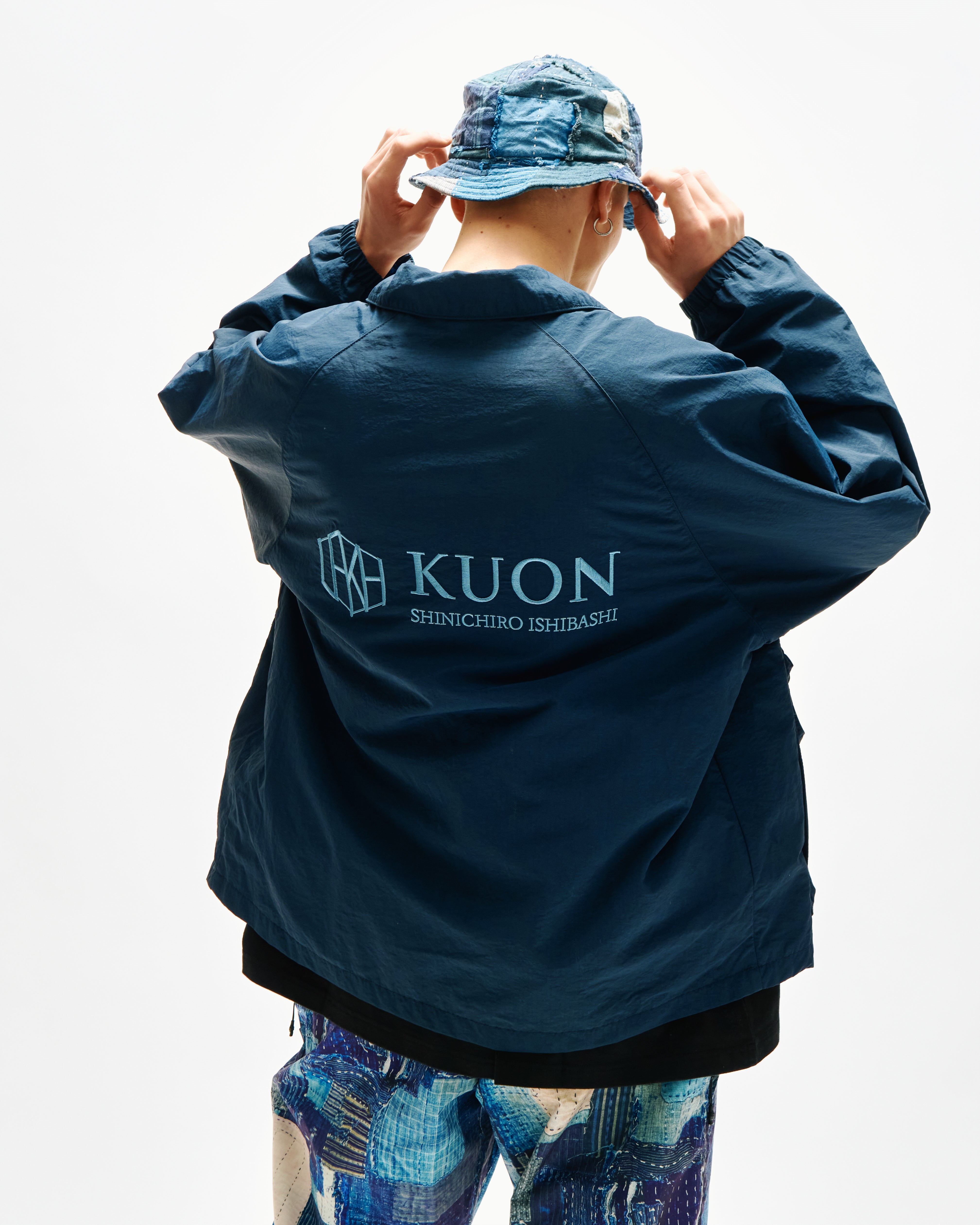 LAKH collaborated with Japanese fashion brand KUON, reinterpreting Japanese traditional BORO and SASHIKO techniques of the Edo period with a modern streetwear perspective. The Reversible Coach Jacket is crafted from full nylon fabric. Cut to an oversized fit, then embroidered with LAKH x KUON logo at the back. Features reversible design gives you two outfit options in one.