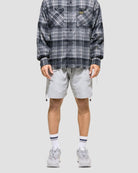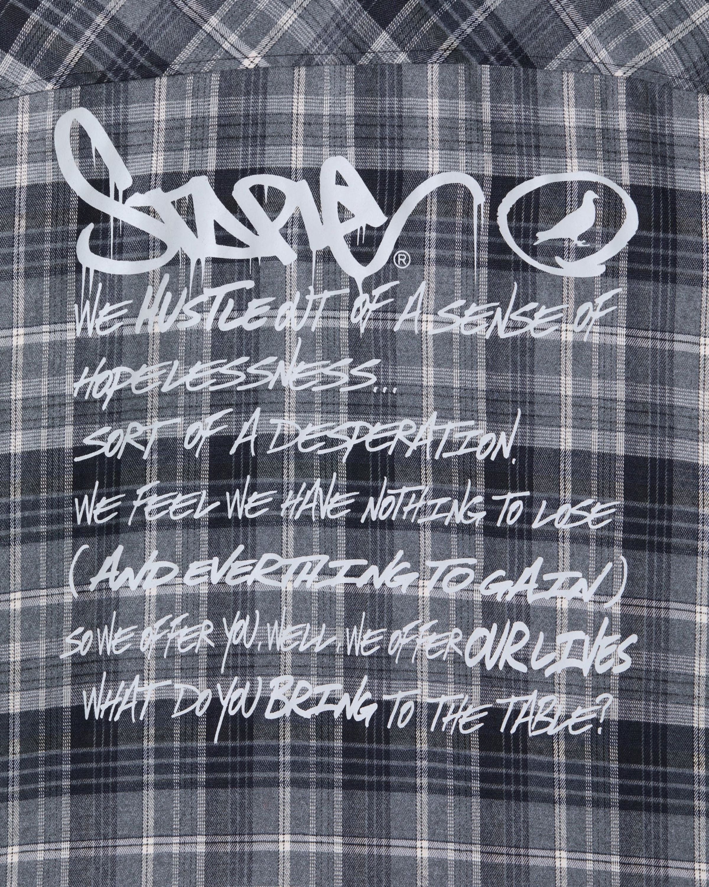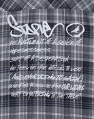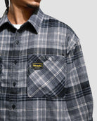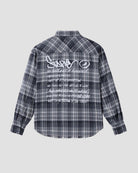 Light flannel button down with double chest pockets, rubber patch, unfinished hem , and printed graphics on back. Model is 5'11" wearing size LARGE